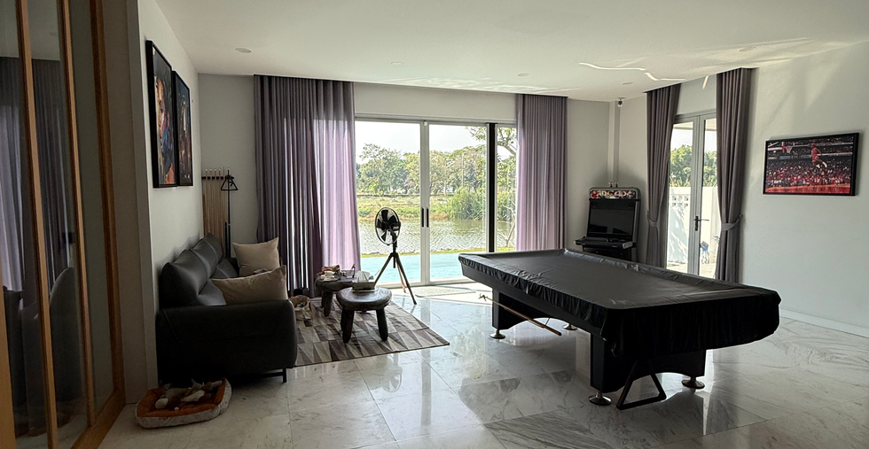 This custom-built, 1,200-square-meter home sits on a 380 sqw plot sitting on a private lake. Located just across the highway from Prawet/Bangkok, it offers massive living spaces, high-end Italian marble flooring, and top-quality fixtures throughout.